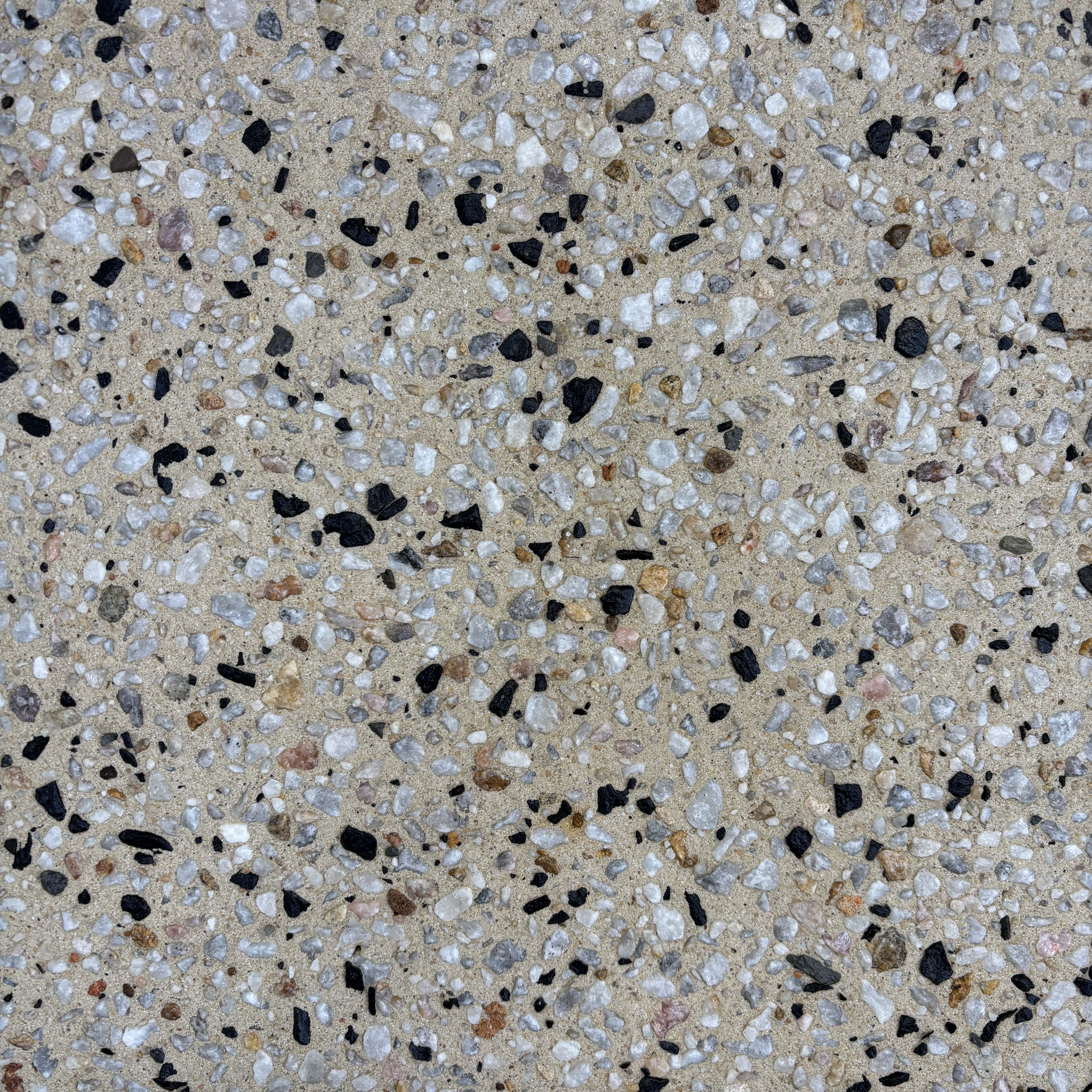 BLIZZARD 91 IVORY is an exposed concrete mix featuring a carefully selected of white quartz with the potential for naturally occurring brownish aggregates and a small percentage of black aggregate, set in off-white cement.