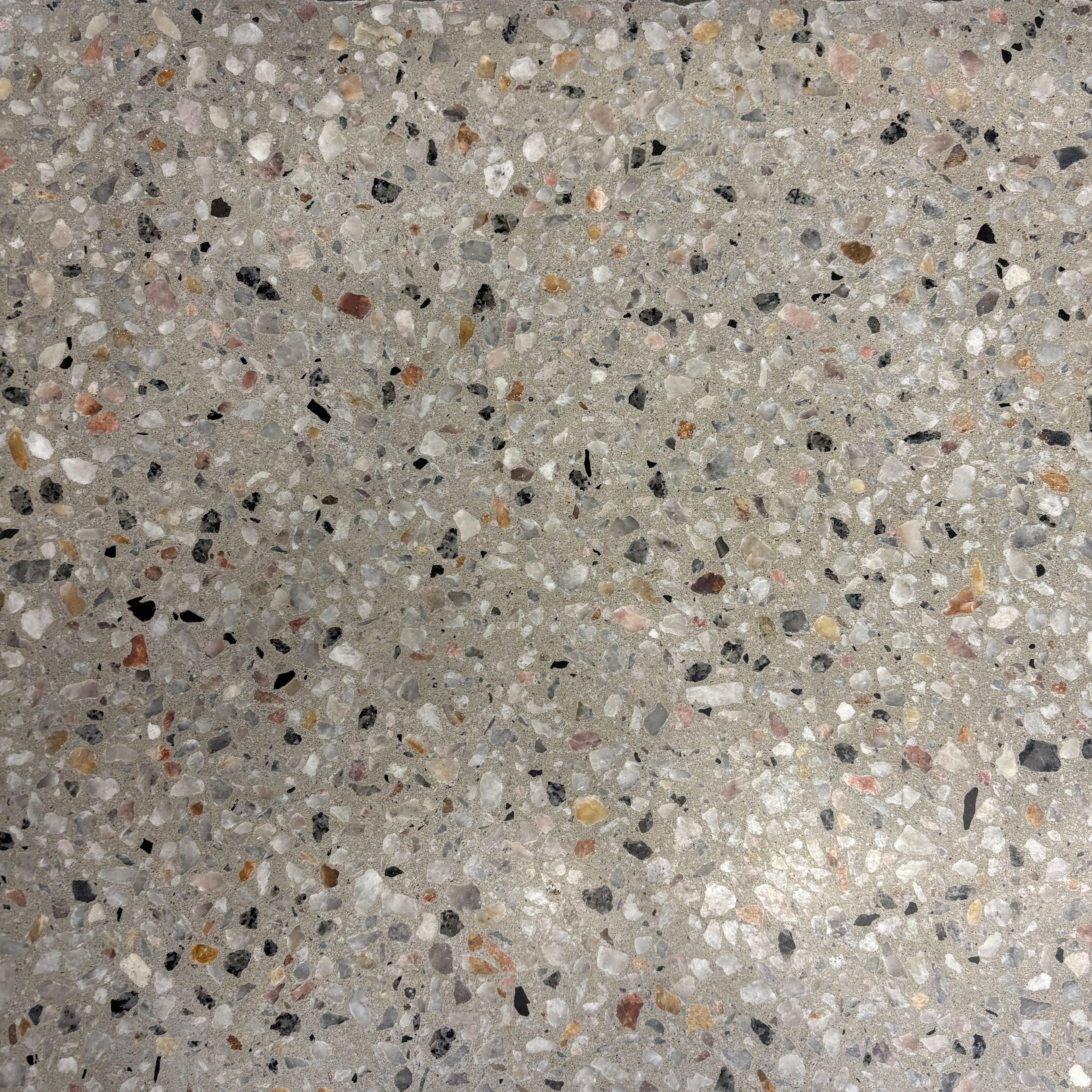 OXFORD 91 ASH HALF WHITE Polished is a concrete mix featuring a carefully selected blend of white quartz with the potential for naturally occurring brownish aggregates and a small percentage of grey granite particles, set in lighter grey cement. This mix offers a refined, modern, and sophisticated finish, making it an excellent choice for contemporary spaces.